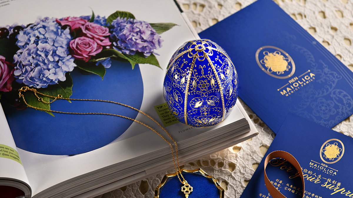 《馬約里卡金喜彩蛋套裝》的設(shè)計源自大英博物館藏品一文藝復(fù)興時期馬約里卡陶盤,將文藝復(fù)興締造者美第奇家族的族徽作為整個設(shè)計的設(shè)計重點,形成統(tǒng)一的設(shè)計語言,將所有產(chǎn)品融為整體。