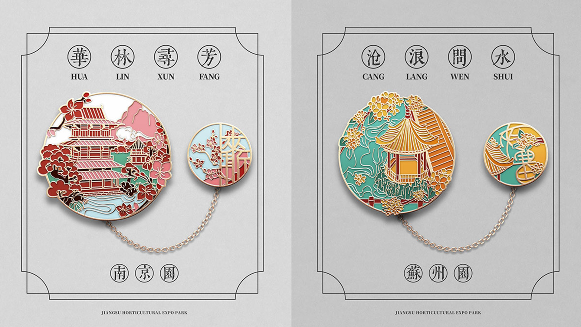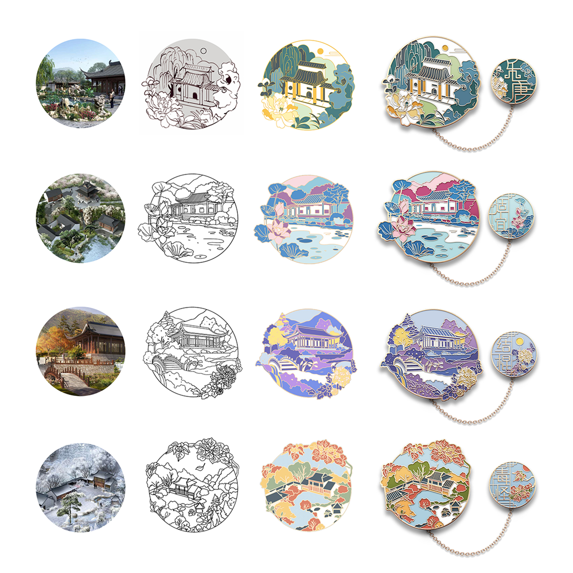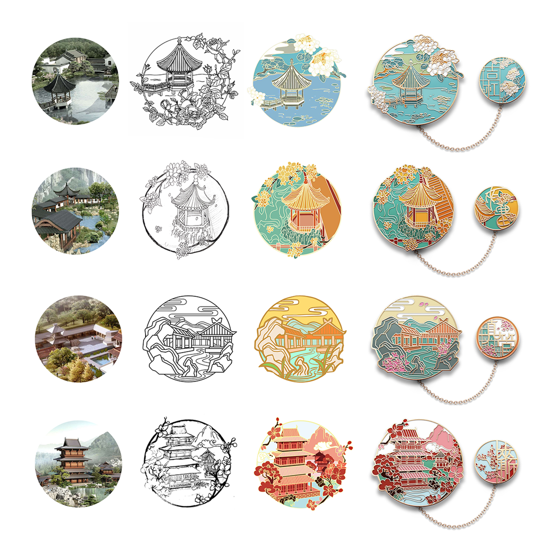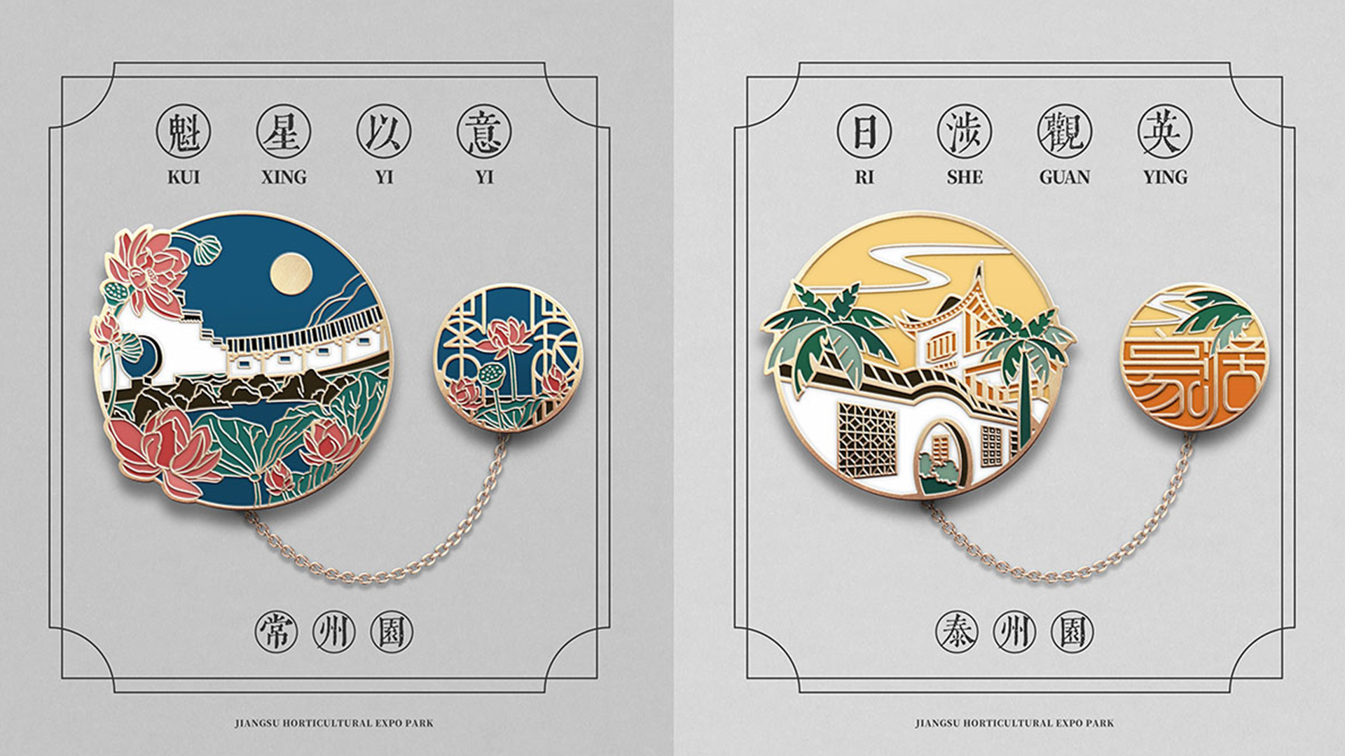 蘇韻薈谷·文創(chuàng)徽章:蘇韻薈谷徽章系列以江蘇省十三市經(jīng)典園林建筑為靈感,分別融入各地代表美好寓意的特色方言,從傳統(tǒng)園林窗花切入,運(yùn)用視覺(jué)立體化手法,形成具有地方特色的徽章視覺(jué)體系。