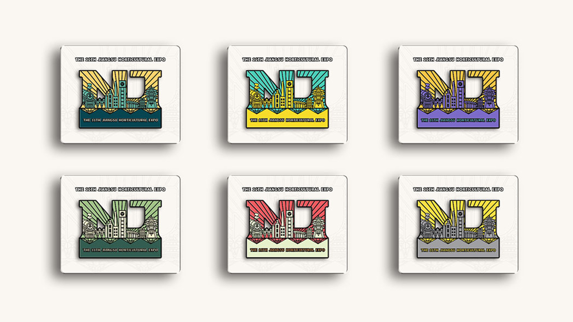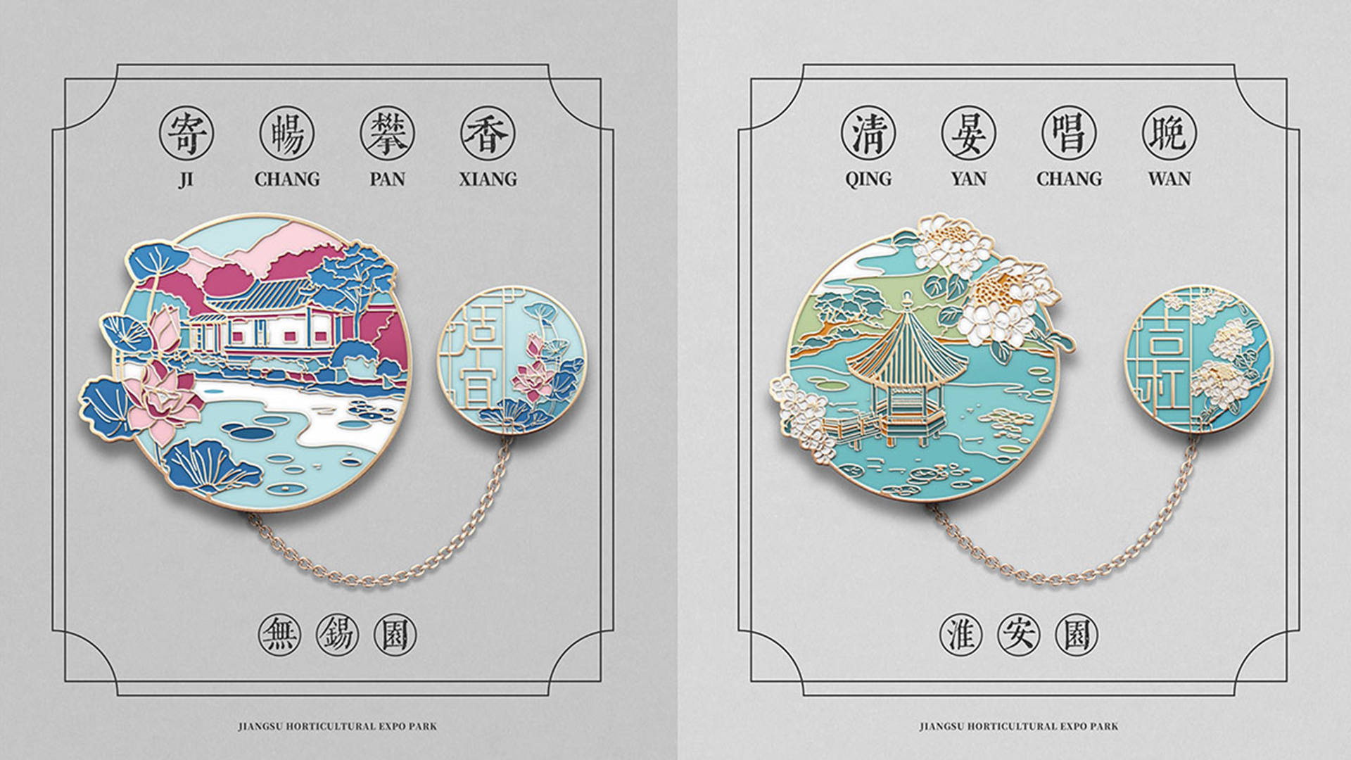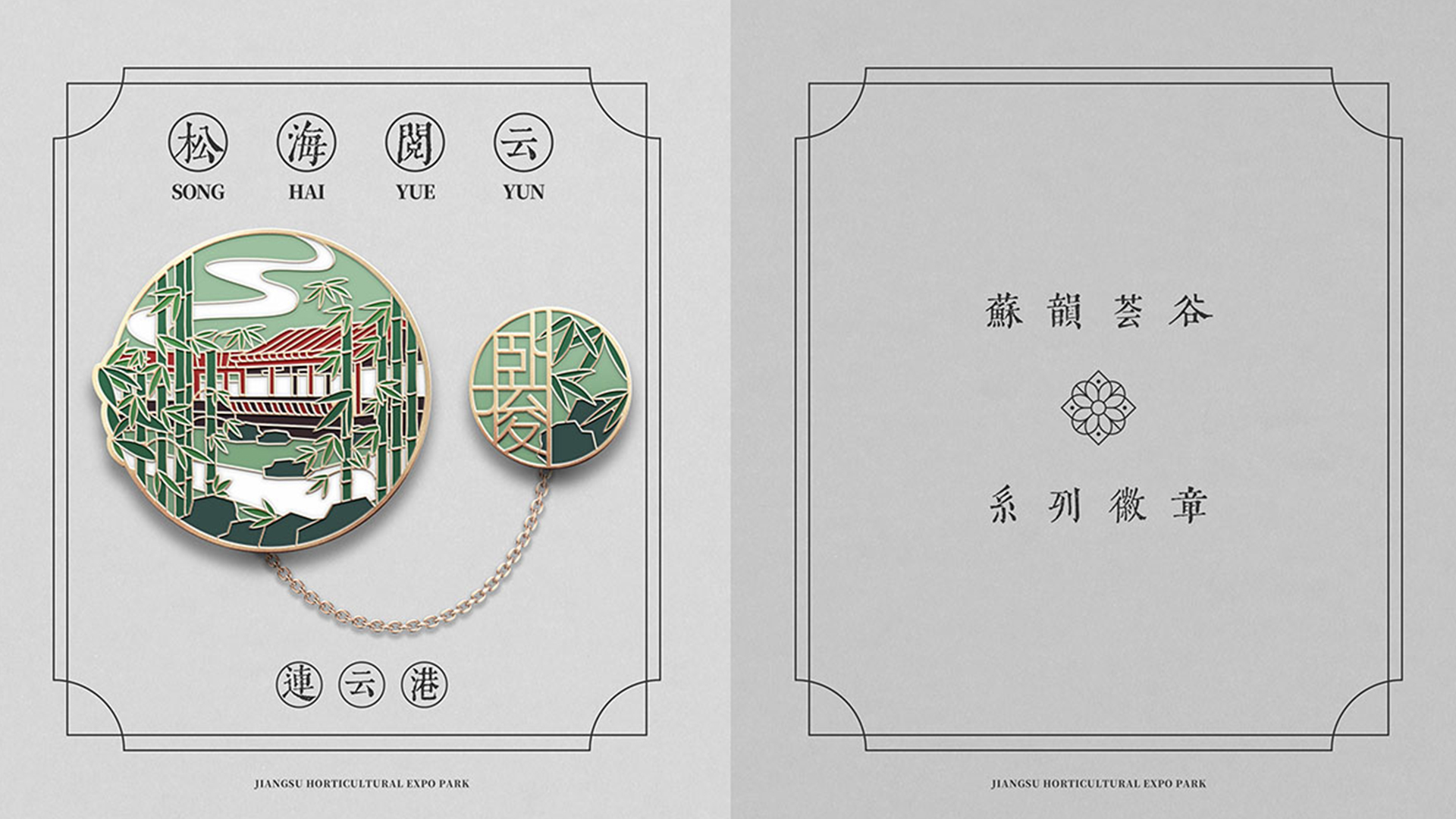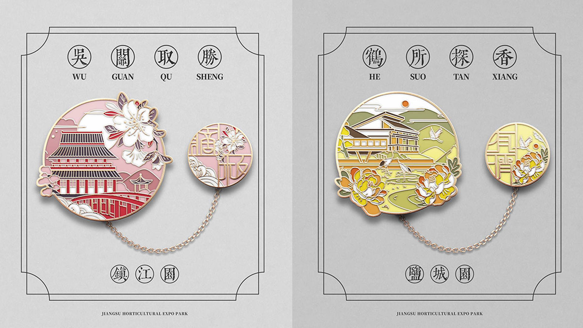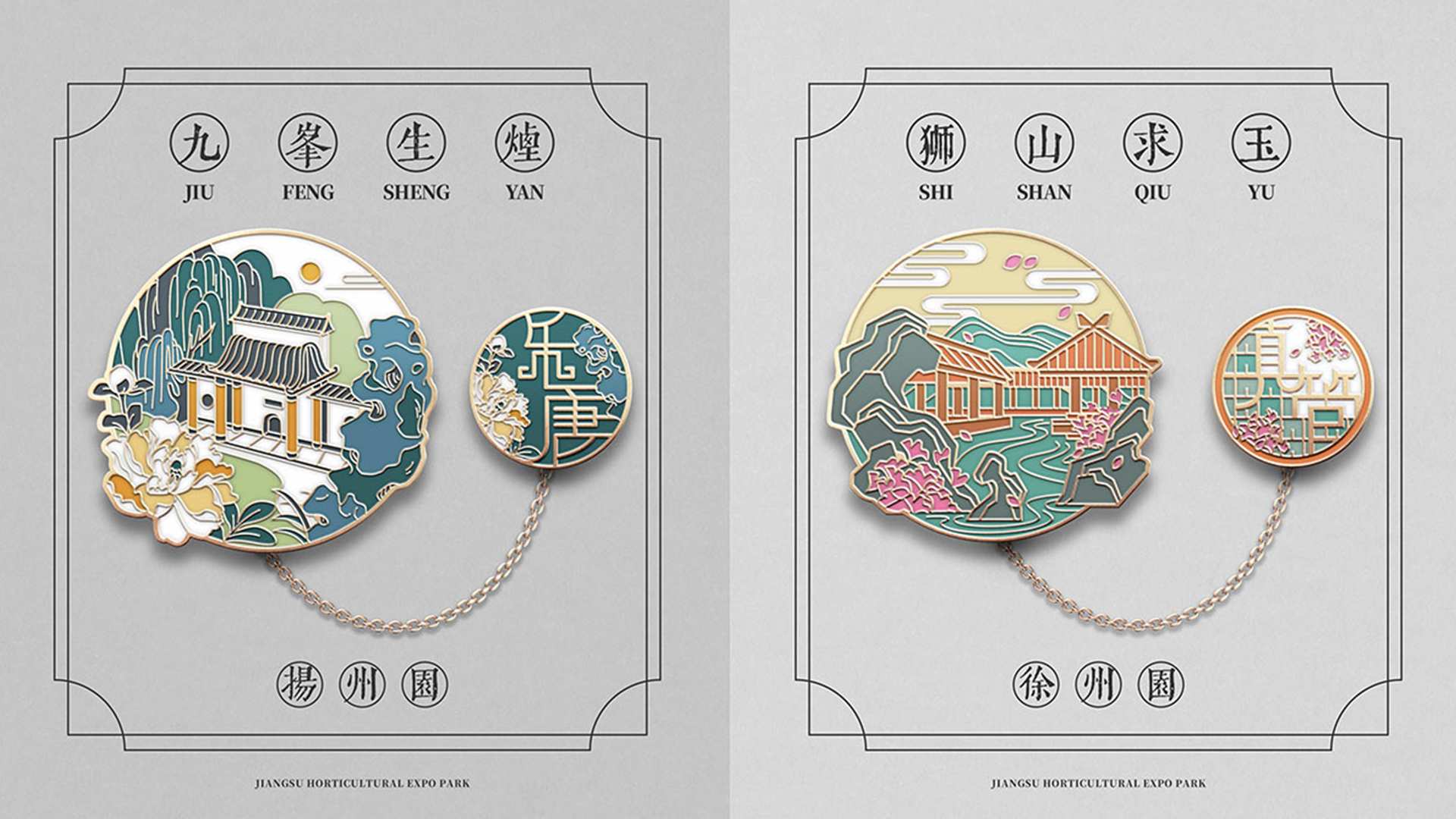 蘇韻薈谷·文創(chuàng)徽章:蘇韻薈谷徽章系列以江蘇省十三市經(jīng)典園林建筑為靈感,分別融入各地代表美好寓意的特色方言,從傳統(tǒng)園林窗花切入,運(yùn)用視覺(jué)立體化手法,形成具有地方特色的徽章視覺(jué)體系。