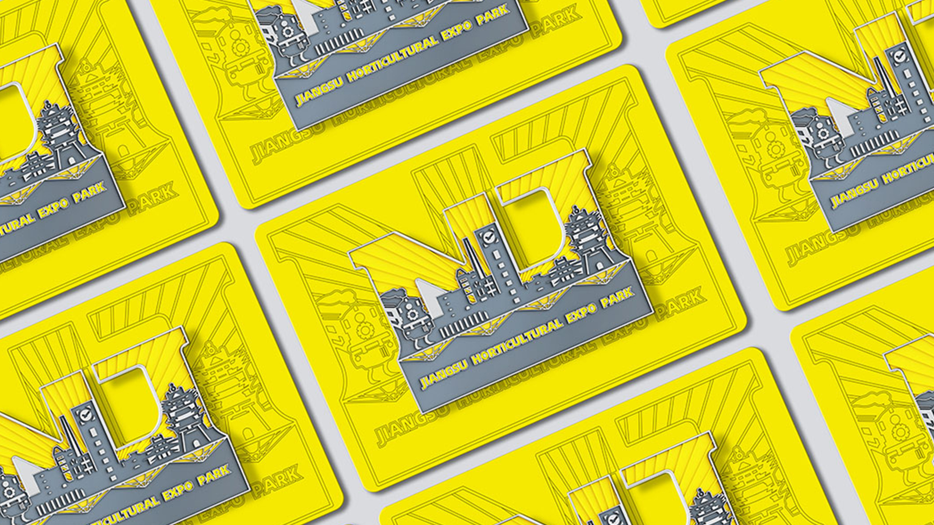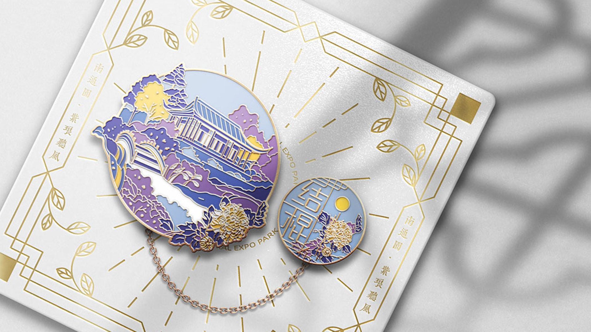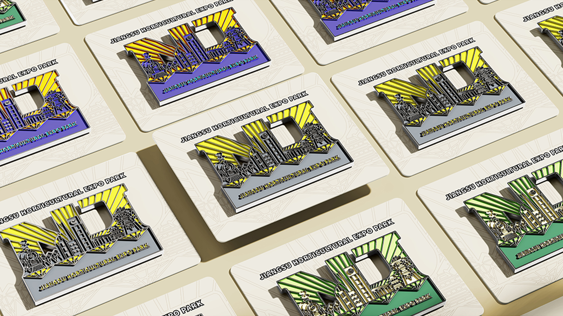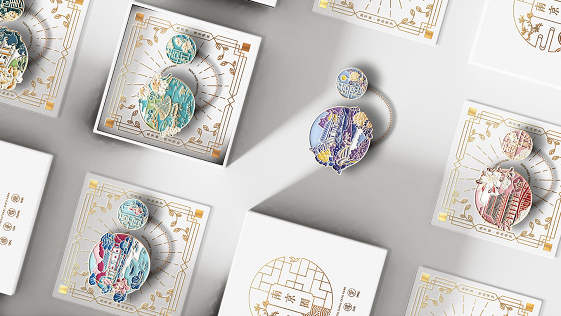 蘇韻薈谷·文創(chuàng)徽章:蘇韻薈谷徽章系列以江蘇省十三市經(jīng)典園林建筑為靈感,分別融入各地代表美好寓意的特色方言,從傳統(tǒng)園林窗花切入,運(yùn)用視覺(jué)立體化手法,形成具有地方特色的徽章視覺(jué)體系。